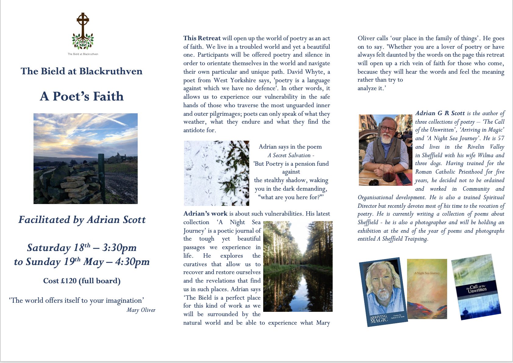 > Adrian G R Scott posted: ” I am giving a short poetry retreat at the Beild > at Blackruthven, Perth. It runs from May 18th – 19th entitled a Poet’s > Faith details below. It is a wonderful place and it promises to be a rich > time. ” >